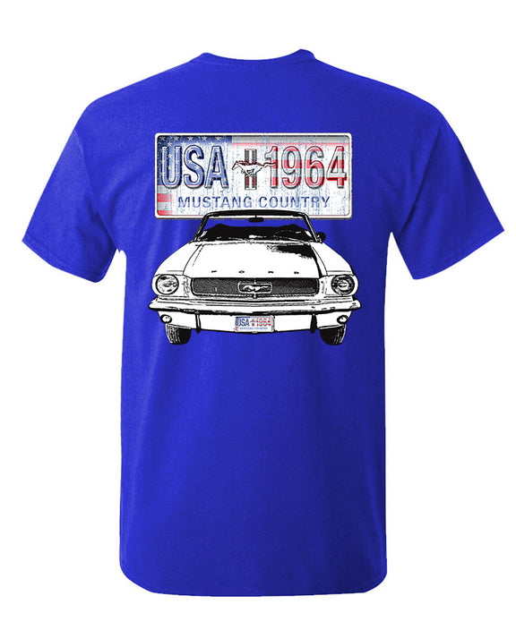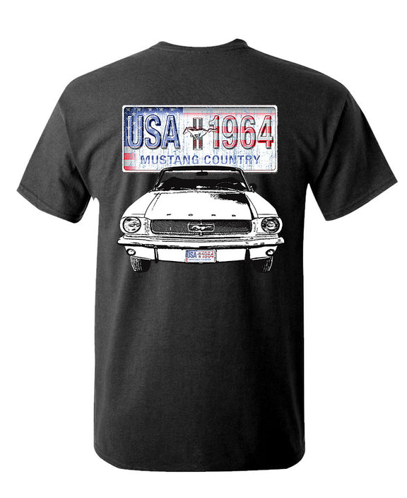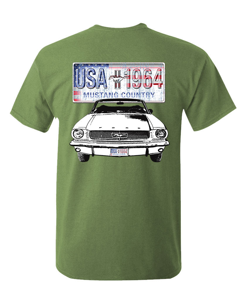 The back showcases a vintage American license plate graphic reading USA 1964 Mustang Country above a detailed illustration of the iconic '64 Mustang front view - the car that defined muscle and style. On the front, a smaller matching chest print completes the authentic retro look.
